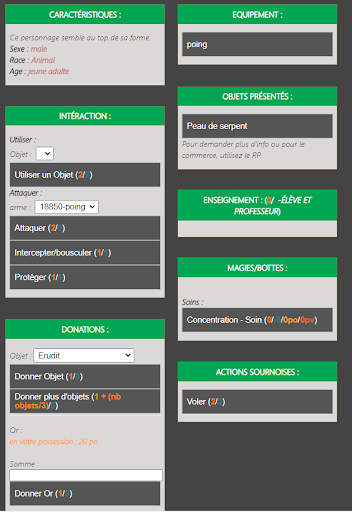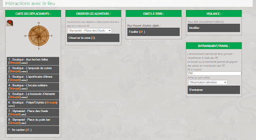 On peut y consulter la page de l’historique (FA Panel), parler, crier, et proposer une action RP à un maître du jeu, pour tout ce qui a du sens en RP, mais n’est pas codé par une formule GP.